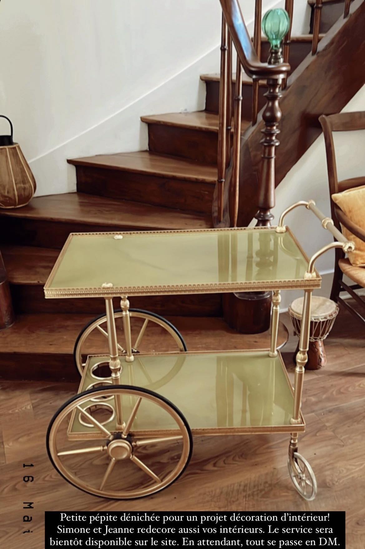 L’une de mes pièces phares dans mes décorations. On charme fou, de l’ancien et une vraie fonctionnalité. Cette desserte était une évidence pour l’étage, où ont été installé tourne-disques et disques qui change de son utilité première (fonction de bar). Le bon coin est parfait pour une pièce forte à petit prix.