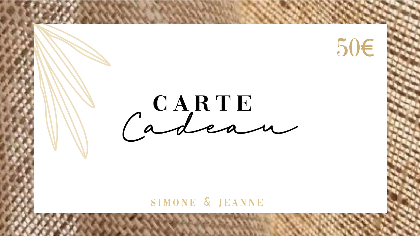 Carte Cadeau de 50€ à valoir sur tout le site Simone et Jeanne. La carte cadeau est toujours une valeur sûre pour vos proches. Une fois votre commande validée, vous recevrez un mail dans avec le code promo pour utiliser ce généreux bon cadeau. Pour faire les choses en bonne et due forme, vous pouvez imprimer la photo de la carte et la glisser dans une jolie enveloppe à déposer sous le sapin, ou pour toute autre occasion.