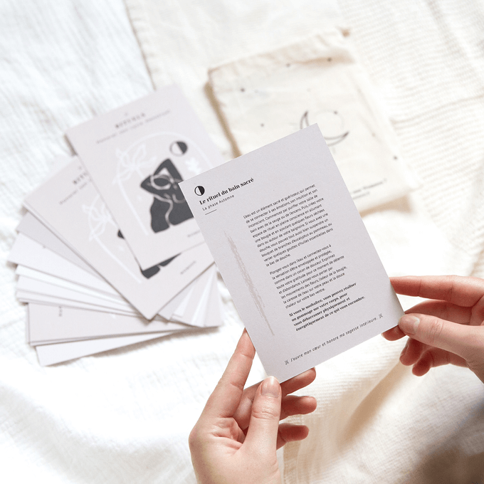 – 1 kit de rituels pour honorer son cycle menstruel avec 21 cartes, dont 16 rituels pour se reconnecter à son féminin sacré